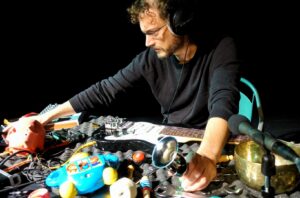 These objects - from your everyday - creates a diverse and playful corpus which stimulates the audience's immagination: a few toys, traditional musical instruments or wild lutes, diy-tools or kitchen utensils, found materials... Rich and varied, these audio materials are ampliflied, sampled and transformed i real time using several analogue and/or computer units. Little by little the musical form is created before the very eyes and ears of the audience.