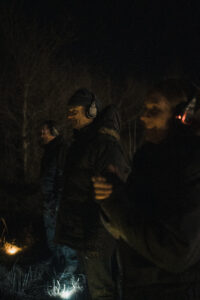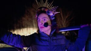 The two cosmonauts Stella and Urania drive towards the audience in their purple-lit spaceship to the sound of music from Star Wars, then hand out wireless headphones to the audience and, in the best astronaut style, conduct sound tests through the wireless headsets. From there, the audience is taken on a journey into the forest and the night, and in a sensual, poetic and humorous way, the cosmonauts open up the universe to the audience with song and performance.