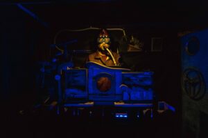En forestilling med spader, hjul og bølger for 7 tilskuere inde i en campingvogn.